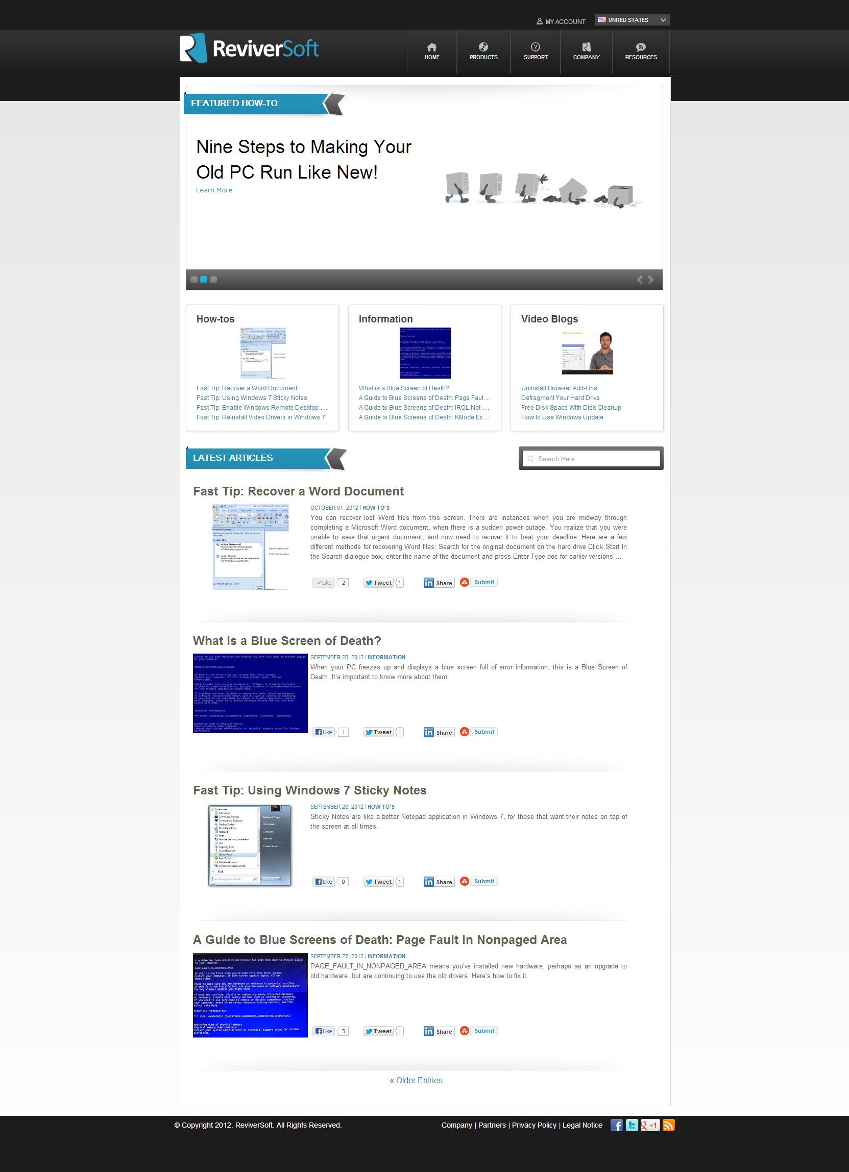 私たちのウェブサイトは多くの目的を果たします。現在のお客様にとって、それは彼らが探しているエリアに進む前の私たちのサイトへの入り口です。 ReviverSoftを初めて使用する人は、ここで当社を調査し、当社の製品について調べます。私たちのウェブサイトは、情報とナビゲーションオプションのハブである必要がありますが、ReviverSoftが企業として表すものと私たちが行うことも反映している必要があります。以前のホームページがこれほどうまくいったとは思わなかったので、新しく始めて再構築しました。私たちの新しいホームページは、あなたが行きたい場所にたどり着くのを助け、同時に私たちがReviverSoftにいる人々と私たちが何をしているのかを説明します。ホームページには、私たちが本当に誇りに思っている素晴らしい新しいビデオもあります!