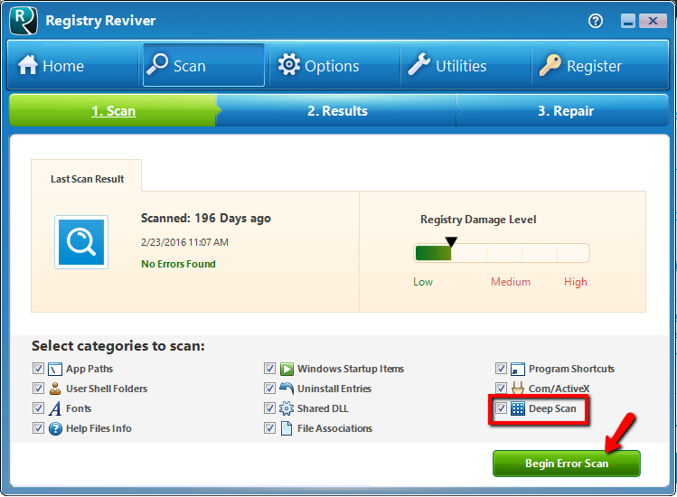 A opção Minuciosa procura por erros de registro em áreas de registro do Windows que não estão listadas entre as 10 seções que você vê na seção Verificação.